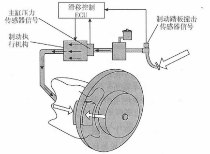 为确定紧急制动的需要,基于主缸压力传感器和制动踏板撞击传感器的信号,滑移控制ECU检查车速和制动踏板施加量。若滑移控制ECU确定驾驶员正试图紧急制动,则立即发送信号给制动执行机构增加液压压力。