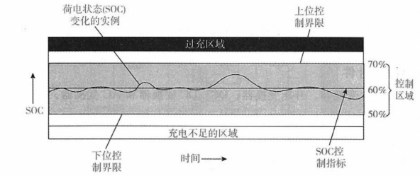 高压蓄电池的电控单元(ECU)控制了蓄电池的荷电状态(SOC),SOC的指标为60%。当SOC下降到低于该指标范围时,蓄电池ECU传递信号至HVECU,然后后者发信号给发动机控制模块(ECM),增加其功率输出,向高压蓄电池充电。正常的由低到高的SOC偏差为20%,如图3-17所示。