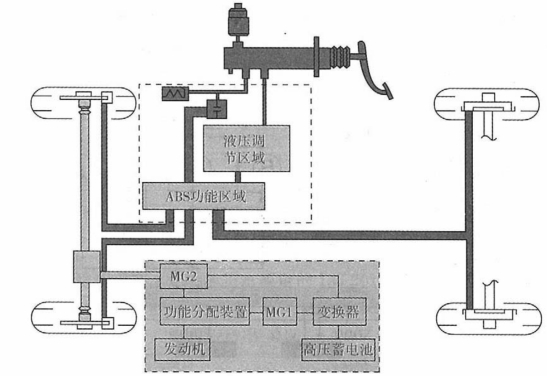 再生制动的协同控制是使再生制动和液压制动的制动力保持平衡,以最小化车辆动能转化为热和摩擦的损失,其回收的能量则变换为电能。
