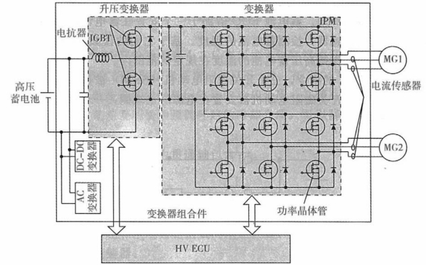 变换器将高压蓄电池的高压直流变换为供给MG1和MG2的三相交流电,如图3-19所示。HV ECU控制功率晶体管的触发。此外,变换器向HV ECU传送控制电流所需的信息,如输出电流量或输出电压等。
