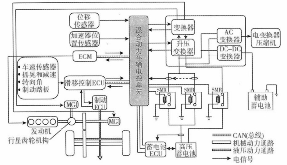 (4)混合动力车辆电控单元(HVECU)。该装置采集来自传感器的信息,并向发动机控制模块(ECM)、变换器组合件、蓄电池的电控单元(ECU)和滑移控制的电控单元(ECU)发送计算结果,以控制混合动力系统。