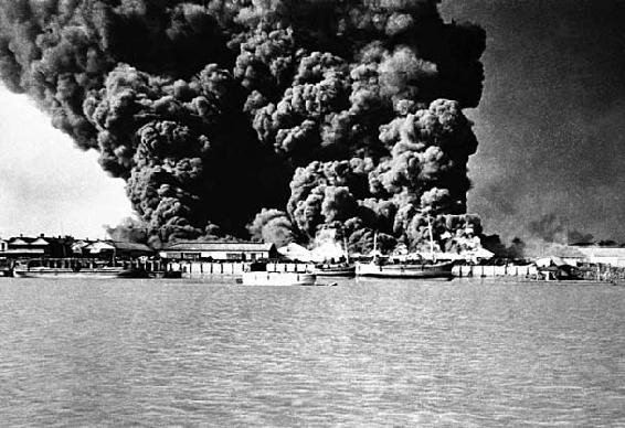 1942年初,在日军侵入仰光之前,最后一艘拖船离开被围攻的仰光。图中位于河畔着火的仓库属于缅甸石油公司