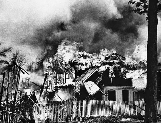 1942年5月,缅甸曼德勒遭日军空袭后燃烧的村庄