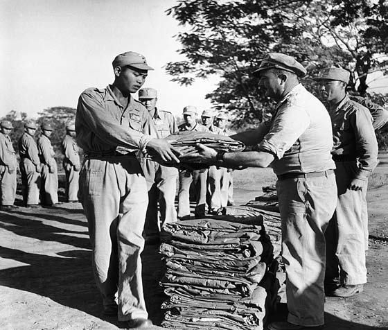 在缅甸的中国军队配备上美国陆军装备和衣物。他们正在排队领取野外吊床