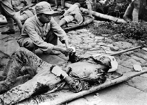 “可怜的地方在晚上,士兵到处叫唤,营长啊!排长啊!负了伤了。天下了很大的雨,泥泞啊,日本人在对面没有法子出去拉,担架也没有法子去,那个惨状啊,真是不堪为外人道啊!”另一位参战的老兵吴俊回忆。