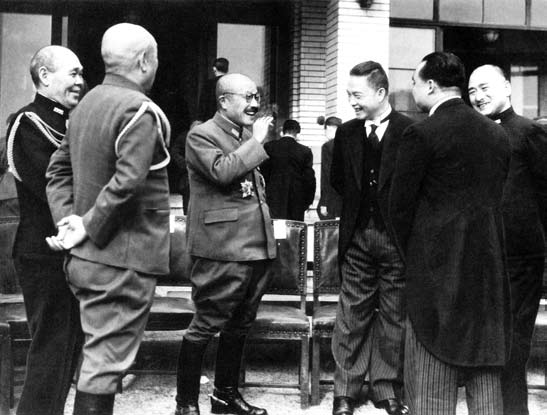 1942年12月,伪南京国民政府主席汪精卫(右三)前往东京,参加“大东亚战争一周年纪念会”。图为汪精卫会见日本首相东条英机(左三)