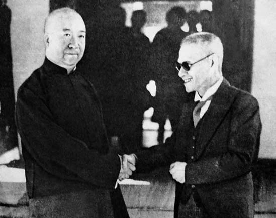 1938年9月,日本同盟社发出有关中国南北傀儡人物梁鸿志(左)与王克敏(右)会商成立“中华民国联合委员会”的消息,日军促使梁鸿志与王克敏组织联合会,便于控制傀儡组织