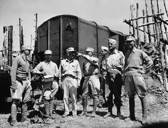 1945年3月8日,新38师团长陈鸣人上校、李鸿、印缅战区总指挥索尔登中将、孙立人将军、埃伦中校及列维勒上校、唐守治(人物左至右)一行查看老腊戍—曼德勒铁路线上的车场