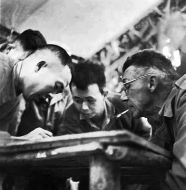 1944年春,史迪威将军(右)与新38师114团团长李鸿上校(左)在缅甸丛林前线一起研究作战方案
