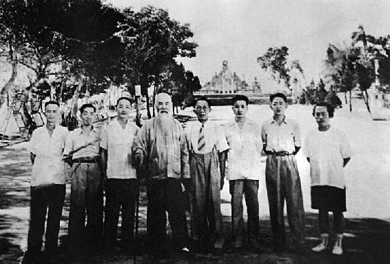 于右任(左四)与罗家伦(右四)、刘延涛(右三)等在广州黄花岗七十二烈士碑前(摄于1949年)
