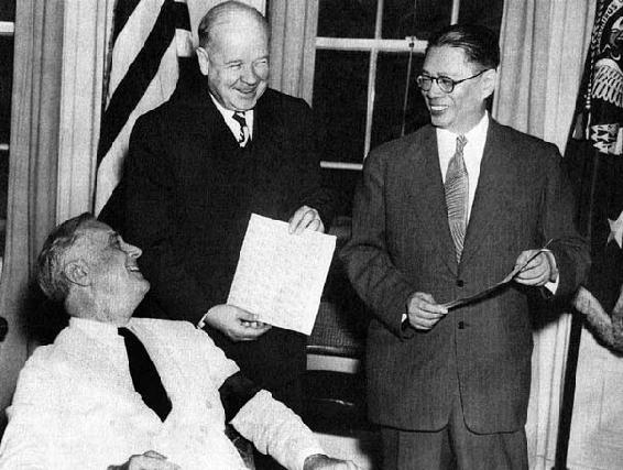 1943年5月,宋子文(右)与美国总统罗斯福(坐者)及美国邮政部长在白宫