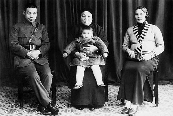 1937年,蒋经国和蒋方良与怀抱蒋孝文的母亲毛福梅