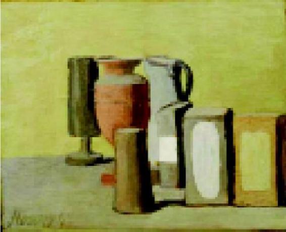 1918和1919年间的这种形而上形式的尝试及其适时地从中抽身对后来形成的那种完全属于莫兰迪自己的静物画风格,无疑有着很深刻的意义。形而上绘画的那种哲学的思辨无疑在观念上打开了莫兰迪艺术思考的深度之维,这也许是决定性的,但同时,哲学的思辨对于艺术而言,它的作用又深深地印在那里,莫兰迪对此有着自己明确的判断,对于借助于某种符号化图式构成的形而上绘画,莫兰迪保留着自己的态度,从他之有别于契里柯和卡拉的静物形而上绘画中可以看出端倪。很快地,莫兰迪重新回归到了面对物体的静观,带着对形而上绘画的沉思重新回到了塞尚的世界,并开始了一种自我风格的确立。莫名之物在此再也不曾出现于莫兰迪笔下,物象回归到了家常日用的瓶瓶罐罐和周边平淡无奇的乡间风景,对象的物理性在此出现了一种新的内涵,莫兰迪式的静观被精彩地呈献,在一种对事物细微的探寻过程之中。