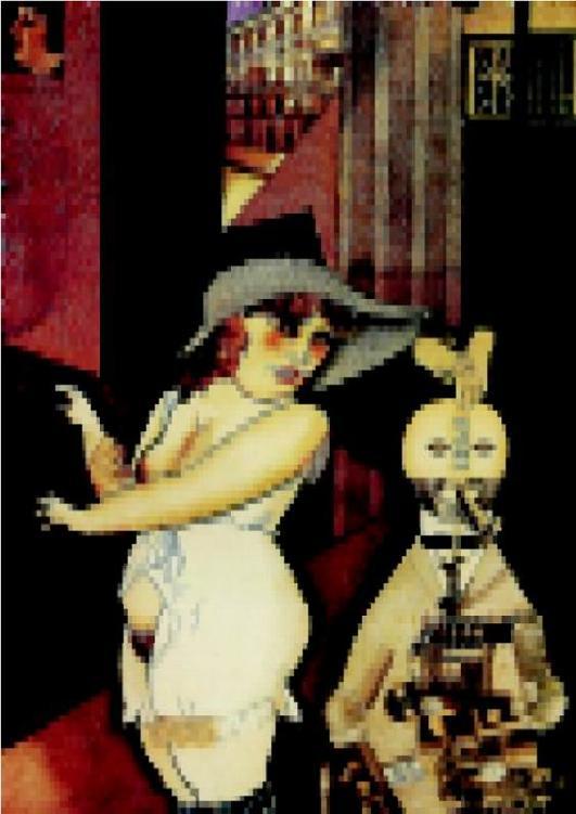 在《献给奥斯卡·帕尼札》中,格罗兹把一个人的葬礼描绘成社会动乱的场面,整幅画都好似被血或火的红色所淹没,几何形建筑物遥遥晃晃地倾斜着,一群疯狂的人聚集在列队行进的棺材周围,死神得意洋洋地坐在棺材上痛饮。所有人物的脸部都戴着令人感到恐怖的面具。在《小谋杀者》中,格罗兹描绘的是暴力和色情的场面,与《献给奥斯卡·帕尼札》一样,画中同样的几何形变体,具有未来主义和立体主义的影子,但画中的躁动,好像暗示着:人类失去了平衡与和谐,失去了理智与秩序。《共和党自动装置》格罗兹借用了契里柯的手法和形而上画派的政治讽刺,来揭露资本主义民主选举的实质:没有头脑、没有面部,手足残缺的机械装置,沿着大都会的街道,按照事先的安排去投票,去参加所谓的选举活动。《多姆在1920年同她的学究式的自动人乔治结婚》是同种类型的讽刺画,但作品中使用了拼贴手法,当约翰·哈特菲尔德看到这幅画时非常喜欢。