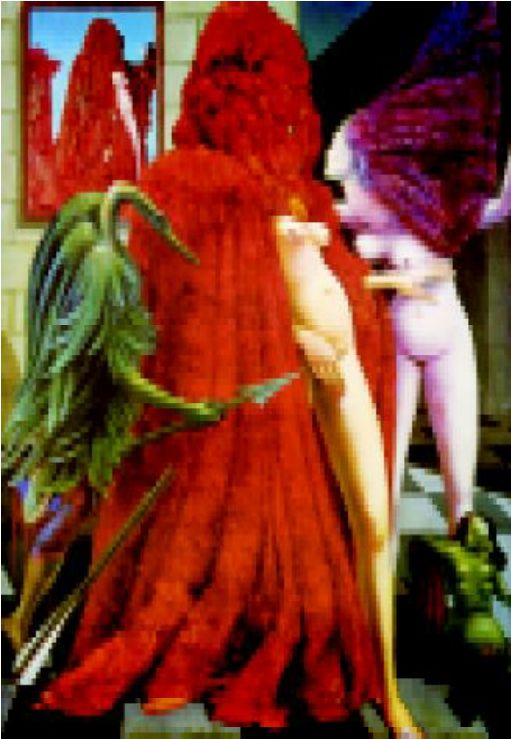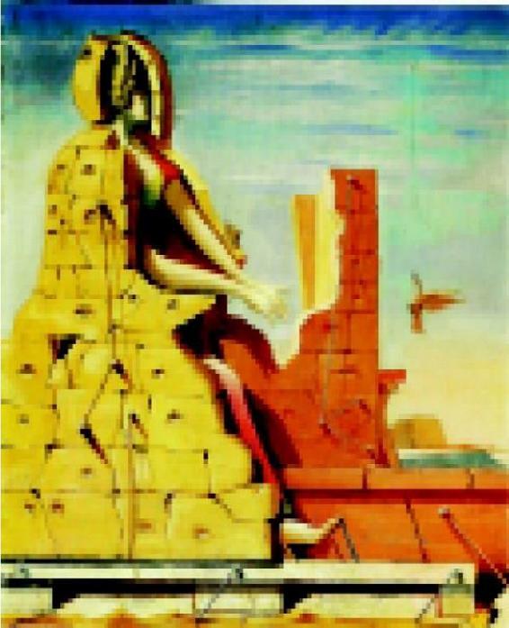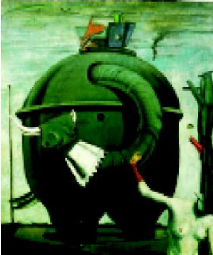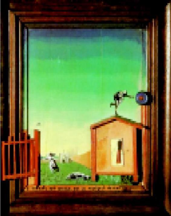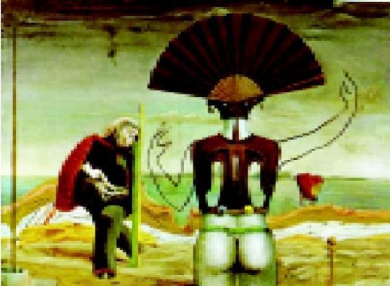 布勒东进而认为,德朗虽然在他的作品中表现了艺术的神奇一面,得到了一种艺术上的自足,它的这种试图超越的因素,体现了一种越超自然的可能,但却依然没能越出绘画的既定模式,是一种自囿,不越雷池。但恩斯特却完全不同,从他这种不断的自求变化中我们可以看出他一贯的态度。在恩斯特看来,现实又如何呢?他认为,现实与绘画两者之间并没有一个明确的隔离,绘画其实也正在现实之中,现实是一种不断的变化,艺术之变,于是也就成了一种必然,“恩斯特断言他没有能力把任何东西悬挂在一个固定的地方;即使是弃之如脱衣那么容易的图形,他也不能保证他所绘制的图形会保持在其所构思的位置,并不会从画框中走下来和恢复我们演戏剧所需的原来状态。”(3)