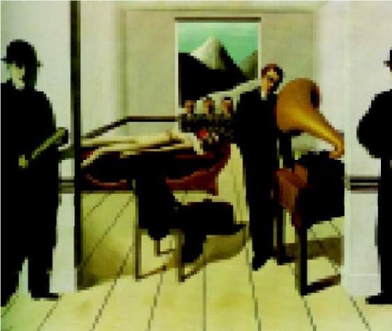 马格利特1898年出生于比利时,一个有着佛兰德斯精确描绘艺术传统的地方,在1922年接触到契里柯的作品《爱之歌》之前,一直延续着他在布鲁塞尔美术学院几年学习得来的表现手法,《爱之歌》的形而上学的意象,让他一下子意识到自己可以做到的一些新的事物。在此后,一种结合了契里柯意象风格和精确表达的表现手法,开始成就了他自己的独特画风。马格利特因而也就成为了第一批的超现实主义艺术家。1926年,他和比利时的几位作家、艺术家组成了一个超现实主义小组,稍晚于当时世界的艺术中心巴黎的超现实主义团体,想必1924、1925年在布勒东等人在巴黎轰轰烈烈的超现实主义活动对其产生过一定的影响,但作为巴黎之外的不多的、目的明确的、正式的超现实主义小组,布鲁塞尔的超现实主义小组的的意义,对整个超现实主义运动而言,也具有相当的意义的。在此期间,马格利特最具代表性的作品,是他1926年所作的充满着恐怖和悬疑的《受威胁的凶手》,在这张画中,马格利特展示了他在此后的艺术表现中的主要的艺术要素:日常的场景、异样的状态还有一些色情元素。在画中,马格利特试图展示的场景有些近似后来的库布里克导演的那些恐怖电影,然后总是让自己的身影在画面或者电影中适时地出现,增加着诸多的不确定因素。马格利特自己在画中总是以一个戴着圆礼帽的形象出现,有时甚至是一种隐匿状的,就像是一个控制者和逼视者。《受威胁的凶手》中,服装模特的处境和表情试图表现出一种真实感:凶手正动情地倾听着留声机的诉说:被谋杀的女模特流出的是真正的鲜血。这一场境就象是一场预谋的结果,是一种再造的现场;而同样充满了人造景观意味的,还有这个舞台布景式的空间和窗外监视着的,还有前面的潜伏者。