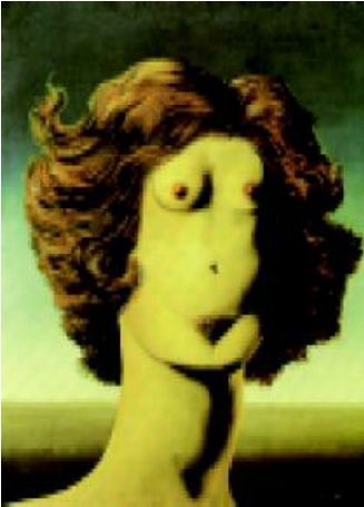 离开了巴黎这个世界的艺术中心,马格利特也就因此离开了关注的中心,可以说,在1965年纽约现代艺术博物馆举行的回顾展之前,马格利特就像是一个不抛头露面的隐者,没有引起人们应有的注意,对于一个自愿淡出注视中心的人来说,这种安于平静的状态我们只能说,这也是正是一种马格利特式的形而上学思考,马格利特的生活状态,似乎就是一种契里柯式场境的现实版,一种变调。马格利特的不变化有时候也不是必然的,他的变化总是让人感觉到并不突然,似乎只是他一贯手法的变体。他有时会探讨一些吓人的形象,阿纳森在他的《西方现代艺术史》中描述了他的《肖像》的形象组合:“……有时达到令人震惊的地步,标题非常简单的《肖像》是一副静物由简单的一片火腿和酒瓶、玻璃杯、刀、叉等组成,画法极为精确。……这片火腿的中心,瞪着一只人眼睛,很难解释,为什么他喜欢把东西这样并置到一块,搞得这么吓人。”其实马格利特的东西有时候看起来充满了恐怖与吓人的形象,但他的组合却让人看到了他对这种吓人形象的调侃式的应用,让人吓了一跳,又不由得笑了起来,他的吓人与恐怖从来没有一种真正的沉重感,恐怖被一种超现实主义的表达方式消解掉了。比如他在1951年所作的《里卡梅尔夫人》,大卫的古典主义作品中的女主人公在这里被马格里特置换成了一个精细雅致的棺木,斜躺在那张被称之为威尼斯轻舟的贵妃椅上,充满了搞笑的情景。