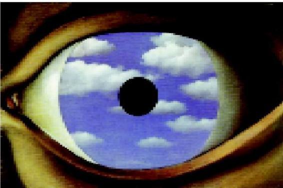 《错误的镜子》中这只被局部放大的眼睛呈现出来的现象在物理学上是具有合理性的。一只观察大自然的眼睛,瞳孔里映现出的蓝天和白云只不过是一种现实场景一种物理反射罢了,马格利特的表现是合理的。但是,这种合理性被局部放大之后呈现出来的人的心里体验却是一种莫名的异样,这首先是因为对于人瞳孔里的世界,人的体验更多的是基于自己的“真实”观察,观者更相信的是自己的眼睛里看到的周遭的一切,这种对景观的感觉甚少从别人的观察处得到,我们从来不会去盯住一个人的眼睛,看看他瞳孔里反映出来的何种境象,若有,也不过是在对方的眼睛里看到我们自己。《错误的镜子》以一种看似真实的存在方式表现的其实是一个虚幻的想象空间,画面因此也变得奇异起来。