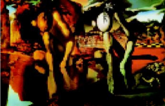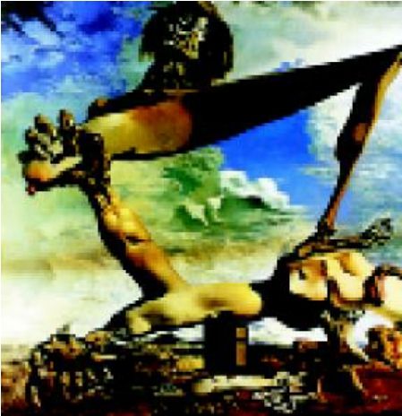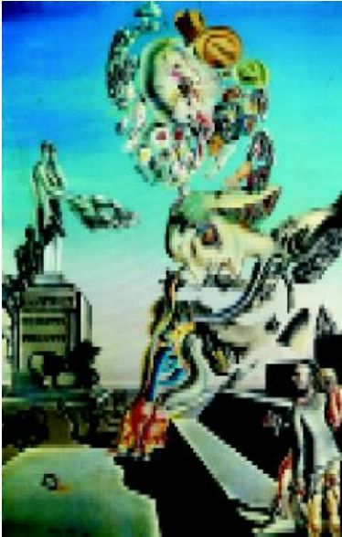 相比之下,1937年的《怪物的发明》的那种冲击力,就显得稍弱了一些,不过,这张画里达利有关的那种关于双重并置、隐藏的妄想狂理论再一次得到充分的表现,画中一如既往展现很多貌似无大相关的事物,通过一种排列的方式,引向了画面中心处的维纳斯的雕像,空间出现错置;远处火正燃烧;黑暗里是一片空虚;达利和他的妻子加拉在画中出现,似乎在谈论某事,但又似乎与他者无关;一群人似乎在进行仪式状的沐浴,以一个个硕大的屁股面向观者,美感荡然无存,充满着某种厌恶的情感,性的象征变成了一种无度的迷恋。