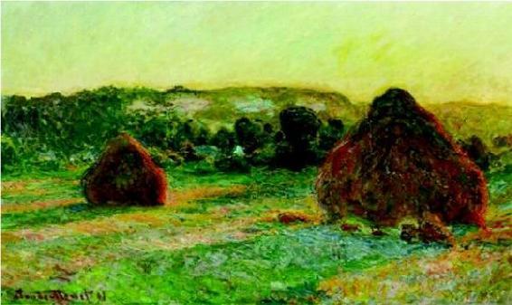 “我突然看到了一幅前所未有的绘画,它的标题写着:《干草堆》。然而我却无法辨认出那是干草堆……我感到这幅画所描绘的客观物象是不存在的。但是,我怀着惊讶和复杂的心情认为:这幅画不但紧紧地抓住了你,而且给了你一种不可磨灭的印象……这种色彩经过调合而产生的不可预料的力量使我百思不得其解。绘画竟然有这样一种神奇的力量和光辉。不知不觉地,我开始怀疑客观对象是否应当成为绘画所必不可少的因素。”(1)