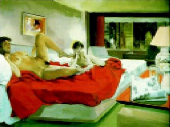 后现代主义的具象画家很多,作品的表现形式和题材也非常广泛,但因它的“无规则”’性,我们很难将其像现实主义作品那样分类,在这里,姑且列举几位美国后现代主义的具象画家以及一些作品。从表面上来看,他们之间似乎毫不搭界,表现手法、风格、内容都相去甚远,但事实上他们所追求的后现代精神却是一致的。