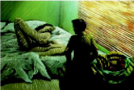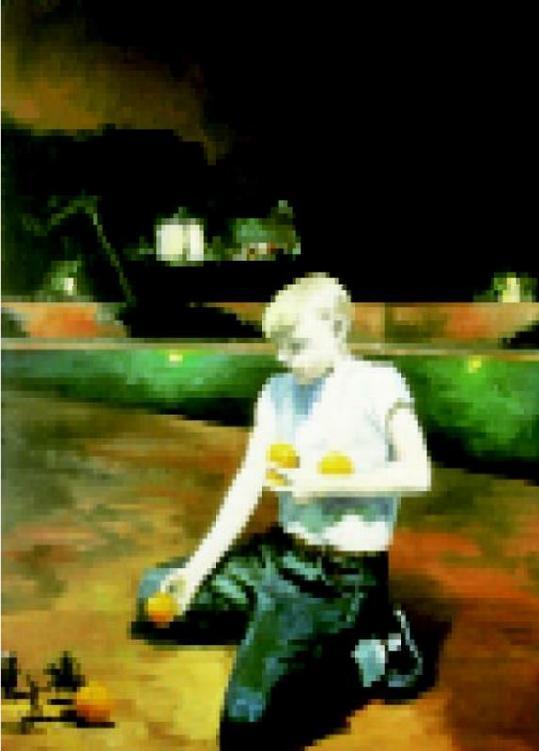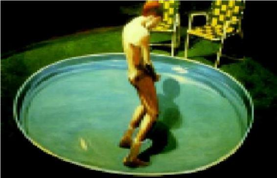 埃里克·菲谢尔(Eric Fischl),1948年出生于纽约,是一个以绘画题材的独特而压倒一切的画家,他喜欢以大幅的“肉景画”来描绘人类生理和心理上的最隐私处。他的著名作品《坏孩子》描绘的是一位少年正在偷母亲的钱包、躺在床上睡觉的母亲正赤裸着身体,两腿叉开着暴露着私处,有一些阳光从百叶窗外投射进来,使空间非常逼真和强烈,观者好像身临其境。作品显然不是色情的,尽管女人体的动态有异传统的人体姿势而近乎于惊世骇俗,加上背对观者的男孩的模糊身影,使整个画面变得十分微妙。作为观者,我们并不想去偷窥什么,但事实上,菲谢尔却一次又一次地让我们当了偷窥的人。在《梦游者》中,日光笼照的后院里,蓝色的塑料盆中,一个男孩屈膝低头,正用双手把玩着生殖器,是手淫还是小便还是好奇抑或还有别的什么?观者不能不去仔细观察和分辨。在《午间沙滩上的窥视》里,一群有闲阶层的裸体男女,在赤裸裸的那一刻互相看着,到底在看些什么,交代得并不清楚。《老人的船与老人的狗》中,一群裸露的男人女人正在度假,但作为船主的老人却没有出现,只有狗正抬头半张着嘴,是在叫还是看到了什么,令人寻思的整个画面的气氛极像《梅杜萨之伐》,休闲的场景下充满着杀机,海的远处景色怪异,礁岩和山面目狰狞。