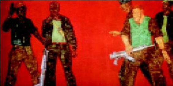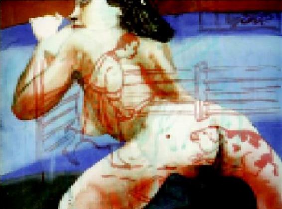 利昂·戈卢布(Leon Golub),是一个遵循杜米埃、高更和贝克曼传统的艺术家,长期以来他一直固守己见,以“被人视而不见”著称。起先戈卢布是芝加哥战后具象表现主义运动中一位颇有影响的人物,1922年他就出生在这个城市,1956—1964年间他曾移居欧洲,其间他通过对原始、希腊、罗马、和亚述艺术的潜心研究,执着地追求着自己对形式的独特感受。此后他又迁回美国,定居曼哈顿,开始着手他的将具有潜在力量的美国风格和自己深切体会到的政治利益联系起来的绘画,但是由于他作品中图像反映的普遍性,即不典型性,加上画幅尺寸的巨大,因而显得平淡没有冲击力。直道1982年,当他的组画《雇佣兵》中的第一批作品问世时,观者方才为之震惊。《雇佣兵》所反映的是实实在在的一群特殊人物,画家为了深刻地揭露酷刑和恐怖主义的邪恶,不知道出于何处的灵感波动,产生了一个绝妙的念头,他把“政治罪犯在其牛仔似的横行霸道、性感和负罪的满足中,表现得具有十足的人性、魅力而且具体入微,同时把遭恐吓的受害者减化成几乎不值得同情的无人性、无特征区别的一种状态”。(19)戈卢布稍晚些时候创作的组画《白兵班》,用的也是这种创作方式,画面上生硬的色彩、扁平的形体与具体的叙事细节的刻画,使人觉得这是一些曾在现实中耳闻而未见的暴徒,虚构的背景十分夸张。人们认为,戈卢布的艺术在传达信息的方式上不是像以往的政治性绘画一样以幽默和讽刺性见长的,但是,从某种意义上来说,他的这种平和、暖昧、朦胧的风格倒显得更严肃和执着。