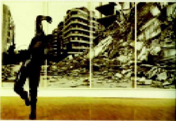 罗伯特·朗戈(Robert Longo),1953年出生,是一位多才多艺雄心勃勃的画家。朗戈是以他的许多大幅黑白炭笔素描,如《城市人》组画而崭露头角的。这些作品创作于1970年代末80年代初,图中的人物似乎都在跳夸张的舞蹈,挣扎于悲哀痛苦或疯狂的喜悦中,这些人物的身上有一种凝聚了力量的能力好像要随时散发,使人过目难忘。他的一些雕塑也是同类题材和形式的作品。他在作品的创作中用的是一种远视法,先把事先拍摄好的人物形象投影在一个大画面上,再把一些其他照片上的局部,或头或手或腿结合起来,做成一个非肖像的原型。朗戈住在纽约华尔街附近的高楼区里,每天目睹的是周围机械而忙碌的人群,这些中产阶级不动声色、冠冕堂皇背后的争斗与敌意,给了朗戈《白色骚乱》组画以灵感,画面中的人物穿着体面的服装推来搡去,好像是狂欢乱舞一般。朗戈还作了一些从形式上一看就很有拼合特点的作品,如三联画《装饰的爱》,三联画的左边是用照相写实主义手法在铝板上以丙烯颜料画着的倒塌的桥梁,右边是一团体积较小、非常华丽的涂金石膏花簇,中间部分是胶片状的黑色背景中一对用喷漆法画成的红色情侣亲吻的局部。他的这类作品使人联想起电影、电视、杂志和广告的某些成份。就自己的作品,朗戈曾说:“我试图用我们文化的视觉词汇去讲述我们所了解的历史和我们所生活的时代将如何影响未来。如果说此处有什么启示,那便是希望,对与根本上具有压制性的事物——比如广告——竞争,我就像是宣传媒介的报复者。”