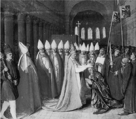 在这期间还发生了一件巧事。教皇声称,找到了一份由君士坦丁皇帝亲笔签署的旧文件,上面写着,教皇是上帝在尘世的代表,掌管所有主教,并将管理罗马、意大利和整个西方。这份文件被称为“君士坦丁的馈赠”。但这完全是一个骗局,这份文件在文艺复兴时被证明是伪造的。但在当时,却十分有利于教皇树立自己的权威。