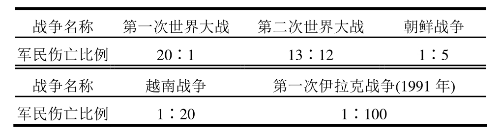 空袭和空中打击就算考虑了人道主义因素,它也有很大的随意性,更何况战争的发动者常常把摧毁后勤及民用设施乃至摧毁城市杀伤平民作为战争和政治的筹码。因而造成了一个近代战争的重要特点就是军民伤亡比例的倒反差,平民的伤亡日益严重。表5给出了第一次世界大战以后几次典型战争的军民伤亡比例,可以看出上述1991年1月~3月多国部队参与的伊拉克战争,军民伤亡比例竟是1∶100,即前线的军士每死亡1个,后方的老百姓要死亡100人。