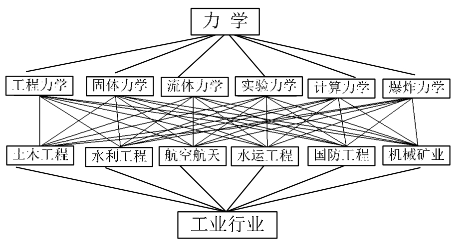 图4形象地给出力学各分支学科与工业行业各分支行业的密如蛛网的关系。这个“网”让人们看到了几乎任何一个力学分支在每一个工业行业中都能发挥作用,换言之,任何一个工业行业对每一个力学分支都有需求,以比较“偏远”的爆炸力学为例,无论土木、水利、国防、矿山等都需要它的参与与指导。
