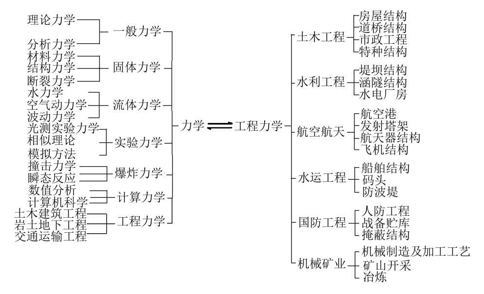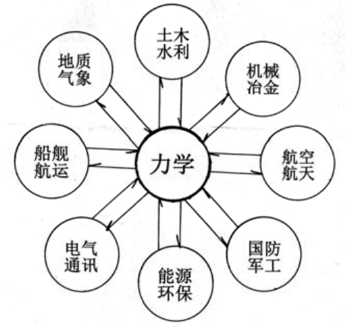 图2示意性地给出了力学在国民经济各领域的重大作用的示意图,从土木水利到电气通讯,从地质气象到机械冶金,力学几乎无处不在。
