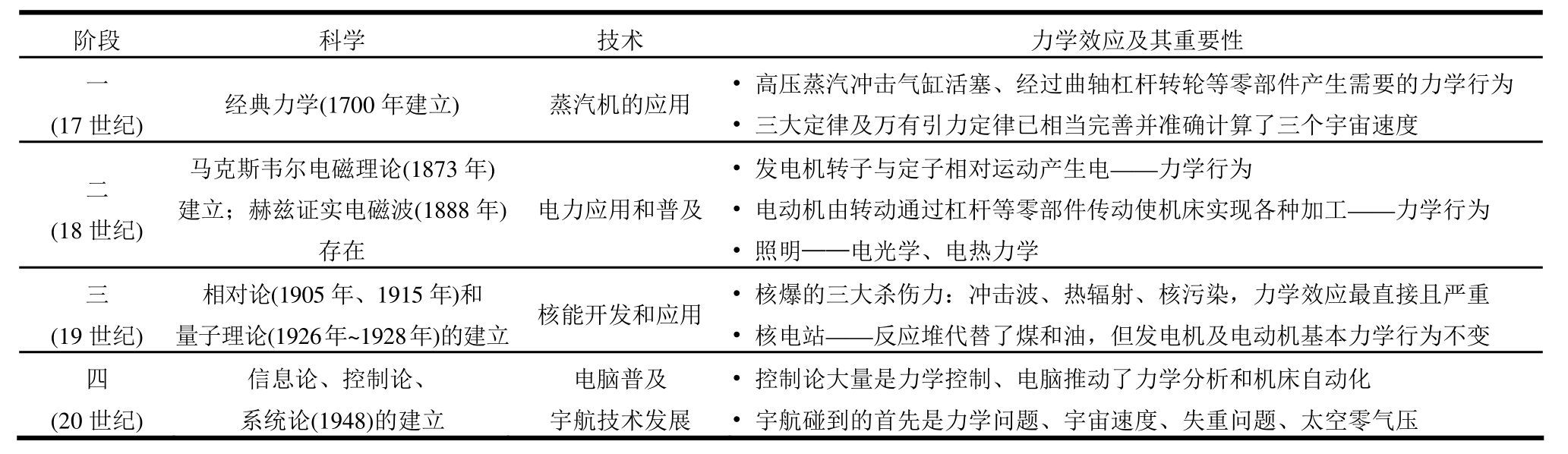 表1给出了不同时代科学技术的发展与力学的关系,可以看出在科学理论上经历了 17世纪牛顿力学的建立到 20世纪信息论、系统论的诞生,而在技术层面上则先后经历了蒸汽机、电磁、核能和电脑、宇航等不同的发展阶段。