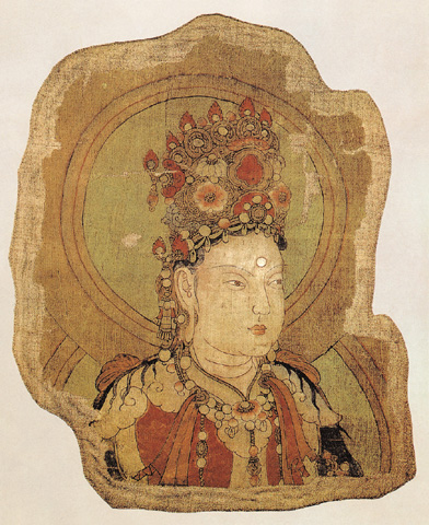 这一菩萨头像,冠饰华贵雍容,面庞如满月,脸形已从晚唐的丰满肥硕转向北宋的清俊娟秀。用的线条细腻匀整,转折不大而富有弹性,适合表现女性面部特征和装饰品。此菩萨头像为残片,二十世纪初在新疆东部地区发现,后被德国人掠走。