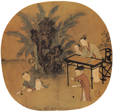 此图原载《宋人名流集藻册》(见《石渠宝笈续编》)。签题苏汉臣作。古人中有见戏必题曰苏汉臣作,正像见牛必戴嵩、见马必题韩之类。故今改作无名氏。其作风正和陈宗训相似,故列于此。