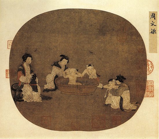 此图展示了古人日常生活中最为常见的场景:为婴儿洗澡。画面设色淡雅明快,气氛温馨和谐,妇人的温情慈祥、婴儿的天真无邪,无不充满了浓郁的人情味和现实意义。图外有“周文矩”款字,系后添。此图当为宋人作品。