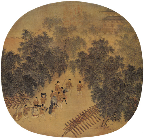 此图原载《纨扇画册》(见《石渠宝笈三编》)。无作者姓氏。画面甚见渺远,充溢了春天的气息。一老者策骑缓行,几个侍从各携椅、凳、食盒之属,可作一幅宋朝风俗画观。