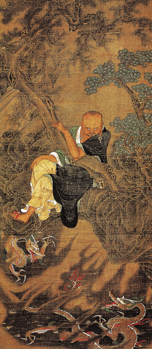 陆信忠,生卒年不详。南宋宁波民间佛像画家,作品多数流往日本。此图中降龙罗汉的形象十分特殊和有趣,图下方有两条飞舞的龙,围绕一宝珠张牙舞爪,罗汉紧张地攀于岩石旁的树上,两眼圆瞪,惊恐万状,具有院体风格,情景交融,独具特色。