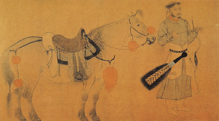 此图在艺术技巧方面,显示出典型的宋代风貌。流畅劲挺的线条,准确洗练的造型,淡雅明快的设色,无疑是承继了李公麟以来的人物画传统,并达到了相当的水平。画中武夫腰弓持箭,立于马前,正在校正箭杆,似在做出猎前的准备。人马刻画最见功夫,活灵活现,血肉俱足。