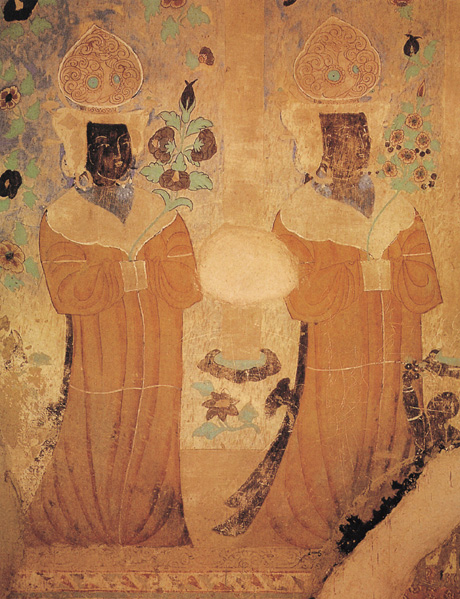 此图画法脱胎于吴道子,将“莼菜条”变化为兰叶描与马蝗苗,线条飞动流利而细秀潇洒。而且勾、皴、点、染并用,浓、淡、干、湿相间,笔墨融和又多变化。西夏时,党项族统治者与回鹘人同信佛教,交往频繁。这副壁画中所绘的两个回鹘贵族妇女,体态丰韵,头顶高冠,手持瑞花,有唐朝风韵。