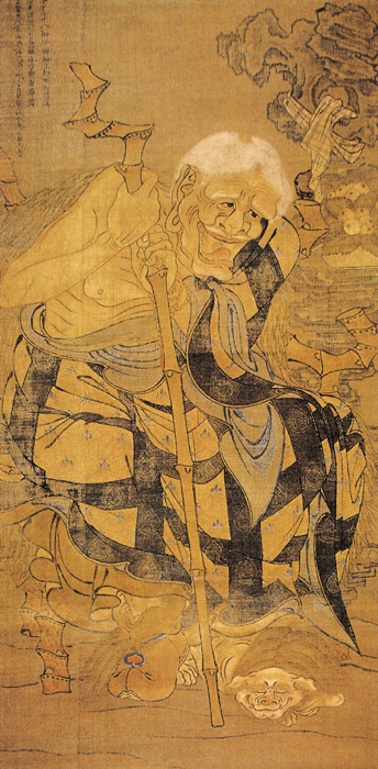 此图笔墨技巧以线描为主,辅以皴染,在塑造人物时,线条力求简练,方折有力,疏密对比。图中所绘罗汉为佛教十八罗汉中第十七位庆有尊者。庆有是难提密多罗之译名,即传《法住记》的作者。图绘一形象奇谲的罗汉袒裸上身,搭披袈裟,手撑竹杖,足踏幼狮,弓腰呈坐姿。