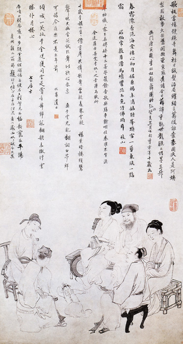 吴伟是戴进之后的浙派名将。是“江夏派”的倡导者。早年画法比较工细,中年后变为苍劲豪放、泼墨淋漓一格。画面正中的歌舞女孩,为青楼歌妓李奴奴,年仅十岁,娇小玲珑,能歌善舞,周围众人正倾心观赏。此图用白描法,线条纤细,略加顿挫,形象清秀,带有拙味。继承了宋元以来的工笔白描人物画传统,属于作者工细一路的人物画风格。画面上有唐寅、祝枝山等六家题诗,占画面大半。
