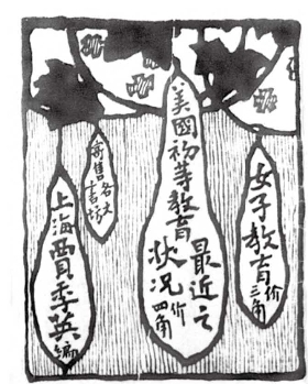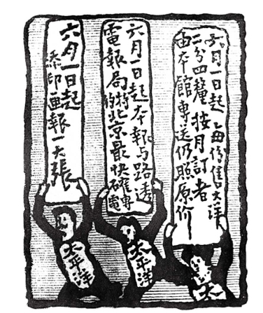 (三)注意生动性和趣味性。广告必须有吸引人的效果。李叔同的设计有些是借用了漫画表现手法的。例如,《太平洋报》启事(图六),主图是三个奔跑叫卖的人,身上都写着“太平洋”三字。《初等教育·女子教育》广告则是藤下垂瓜,上写文字。《福建新闻》广告则是一个漫画人物,大耳大笔。这些构思非常巧妙,形象生动有趣。