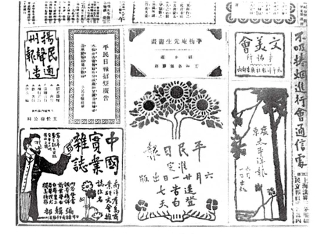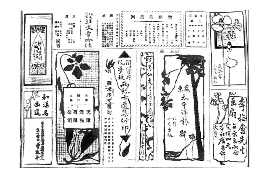 (一)简单明了,注重大效果。运用比较粗壮的线条和黑白相衬效果,使之醒目。例如,《广东太平洋报》广告,主图案是剪影式的高大树干斜立在画面上,在大块空白间,突出几个字。南社启事,主图是两枝挺立的花朵,在花间写了“南社”二字,用“灰”调子的衬地将其托出。天津造胰有限公司广告,主图案是一棵剪影效果的花卉,在图中间用“开光”法,在白地上写黑字,设计极简练,一目了然。(均见图三)