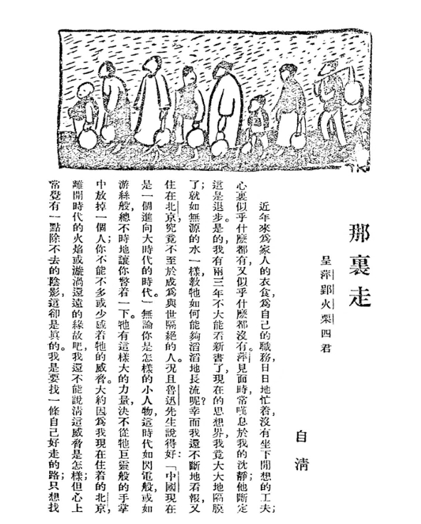丰先生的书刊版面装帧,也和书籍封面装帧一样,有他自己的个人风格,也是以写意手法见长,并依赖黑白效果的相衬,取得良好效果。他为《文学周报》封面所绘装饰,在竖直的一条黑底上以白字书写“文学周报”四字,再绕以葡萄藤蔓。在刊物的顶部则是茂密的葡萄枝叶和果实,是以写意笔法描绘的装饰图案。这种画风,从另一件版面装饰(图一)也能看得出来。再例如,书刊版面基本上有三种装帧方式:一是题图,多采取竖直形式,以题目字体为主,配以花木组成纹样;二是横排形式,在全版文字顶部饰以人物和景物,绘画性较强,基本不属图案装帧一类,如《一般》杂志中的题图,很有代表性(图二、图三);三是文章尾花,是清一色的人物画,有的纯属独立的单幅漫画,例如四川版《丰子恺漫画选》中的《遐想》就选自这类尾花之作。丰先生在书刊版面装帧方面的艺术实践和成就,相较之下,更是一个“神秘地区”。