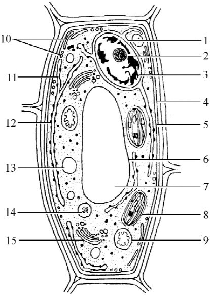 1.核膜 2.核仁 3.染色质 4.细胞壁 5.质膜6.液泡膜 7.液泡 8.叶绿体 9.线粒体 10.微管11.内质网 12.核糖体 13.圆球体 14.微球体 15.高尔基体