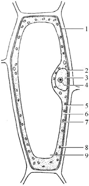 1.细胞壁 2.核膜 3.核液 4.核仁 5.质膜6.胞基质 7.液泡膜 8.叶绿体 9.液泡