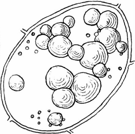 淀粉(starch)为多分子葡萄糖脱水缩合而成的链状化合物,是细胞中碳水化合物最普遍的贮藏形式。光合作用所产生的葡萄糖,一般暂时在叶绿体内转变成同化淀粉(assimilation starch)。同化淀粉再度水解为葡萄糖,转运至贮藏细胞中,并在贮藏细胞的造粉体内重新形成贮藏淀粉(reserve starch)。贮藏淀粉在白色体的造粉体中形成淀粉粒(starch grain),并贮藏在植物根、茎和种子等器官的薄壁细胞的细胞质中。