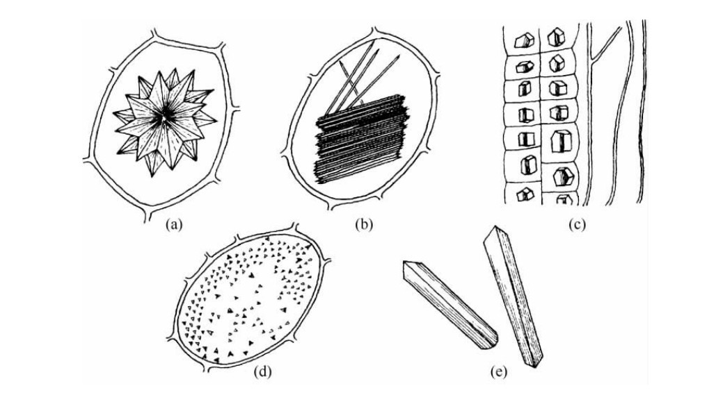 (a)簇晶(大黄根茎) (b)针晶束(半夏块茎) (c)方晶(甘草根) (d)砂晶(牛膝根) (e)柱晶(射干根茎)