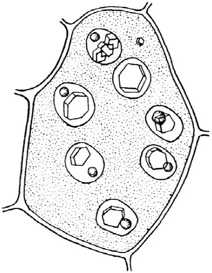 1.草酸钙晶体(calcium oxalate crystal) 为植物体内草酸钙形成的无色透明晶体(crystal)。草酸钙晶体的形成被认为是植物体的解毒机制,草酸与钙结合可减少过量草酸对植物的毒害,但由于植物细胞缺少对草酸钙的排泄渠道,因此只能将这些废物储存在细胞液中,并逐渐增多,形成无色透明的草酸钙晶体。常见的草酸钙晶体的形状主要有以下几种(图11-0)。